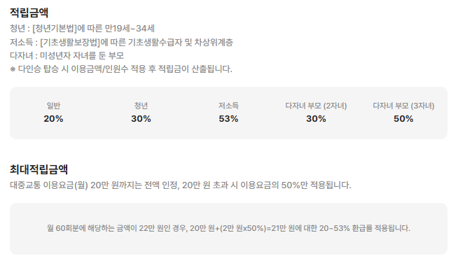 예를 들어, 청년층이 월 60회 대중교통을 이용하고 총 이용 금액이 83,000원이라면, 30% 환급율이 적용되어 약 25,000원을 돌려받게 됩니다.