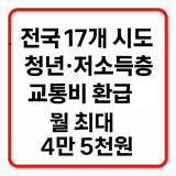전국 17개 시도, 청년·저소득층은 월 최대 4만 5천 원까지! 아직 신청 안 하셨다면 지금이 기회입니다.